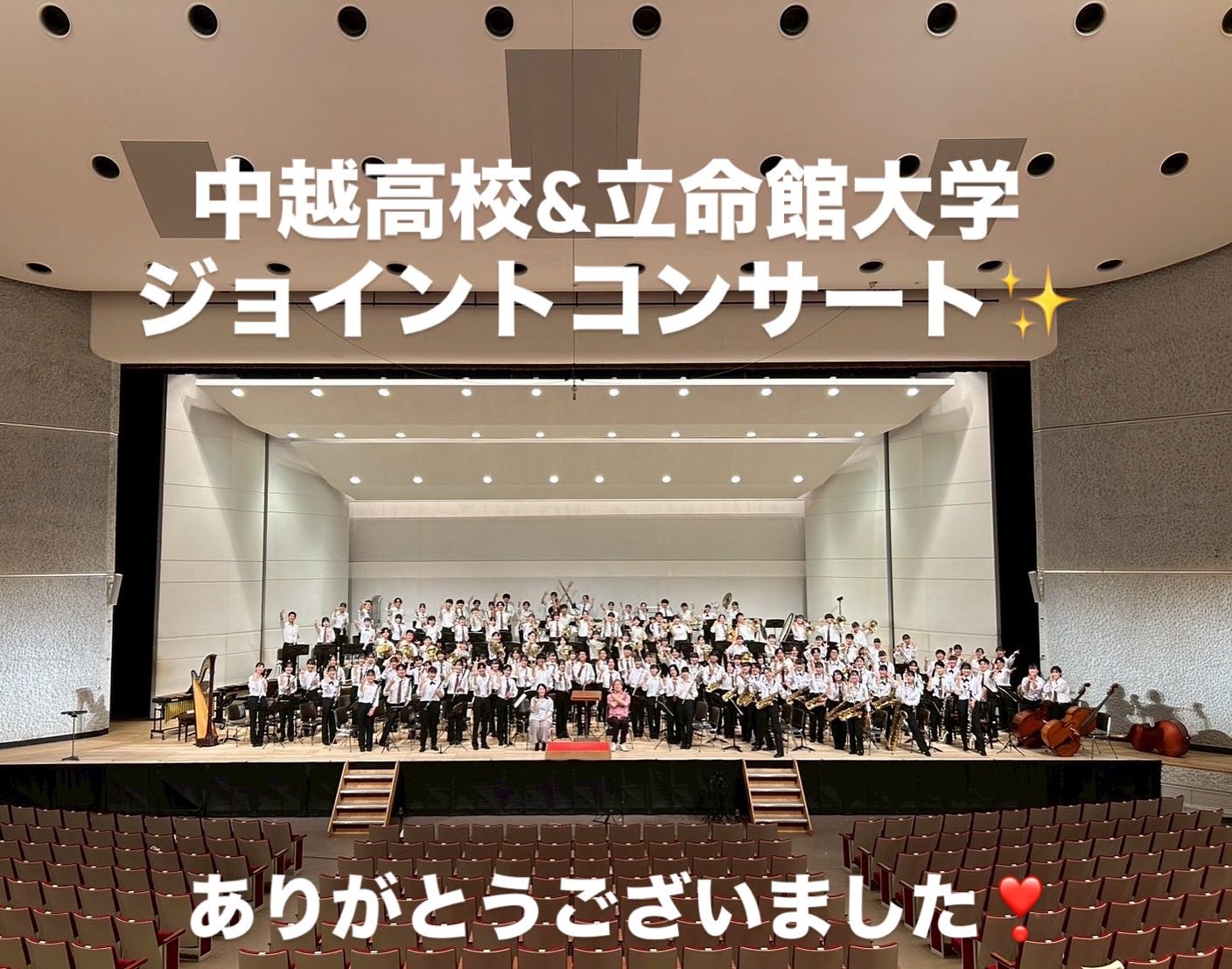 ジョイントコンサート終演いたしました👏✨素晴らしい時間と、人生最高の宝物、学びでいっぱいです!中越高校にとって歴史を変える一日になりました。立命館大学応援団吹奏楽部の皆さま、常任指揮者の金井先生に心より感謝申し上げます。また本日ご来場頂いた皆さま本当にありがとうございました‼️
